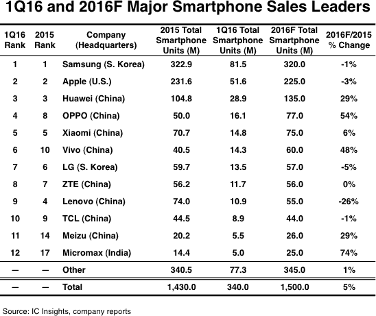 And recently, IC Insights- an industry tracker- has just given the report of best worldwide smartphone sales leaders in Q1 2016. And it’s not a surprise when 8 out of the 12 companies are Chinese brands. Those companies take the 3rd place to 6th position and from 8th position to 11th place. The 7th and 12sc places belong to LG (Korea) and Micromax (India). The final position in this top 12 could have gone to another Chinese manufacturer – Gionee. This company shipped 4.8 million smartphones in the 1st quarter this year, just missing 200.000 units compared to India brands – Micromax.