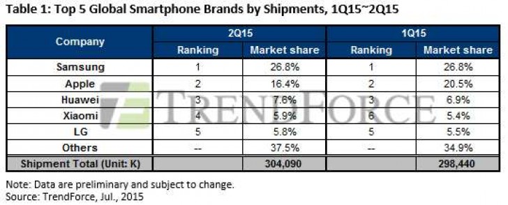 According to TrendForce, Samsung has been the number one for shipments in the Q2 of 2015 all over the world. Its market share accounts for 26.8% and the strong sales of Samsung Galaxy S6 and S6 edge definitely play important roles in that success.
