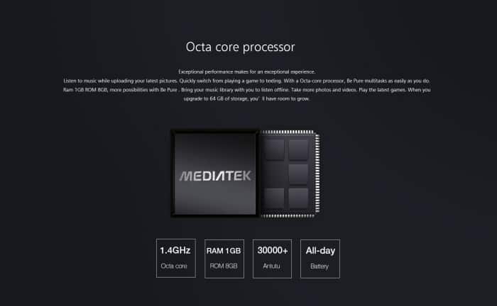 Be Pure is another mid-end smartphone by Ulefone. This handset has a 5-inch 720p (1280 x 720) IPS OGS display (like its predecessor Ulefone Be One). Powering this phone is a MediaTek’s MT6592M octa-core processor clocked at 1.4GHz, a Mali-450 GPU for graphics.