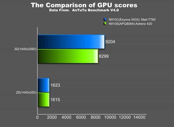 For Performance, first benchmarks from Antutu show that the Exynos 5433 is stronger then the Qualcomm Snapdragon 805 competitor. Even in Graphics Benchmarks, the ARM Mali-T760 GPU on the Exynos 5433 seems to beat the Snapdragon’s Adreno 420 GPU. To be fair Antutu benchmarks, should be taking with a grain of salt though, since they are not always fully accurate.
